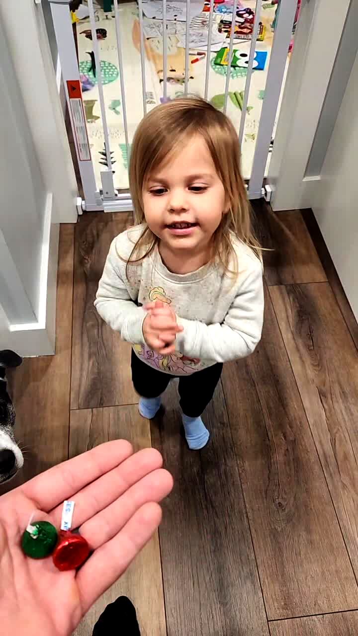 A father holds Hershey Kisses out to his young daughter and asks if she will tell her mother, and the girl says "yes." He tells her that she needs to say "no," and she says "yes" again.
