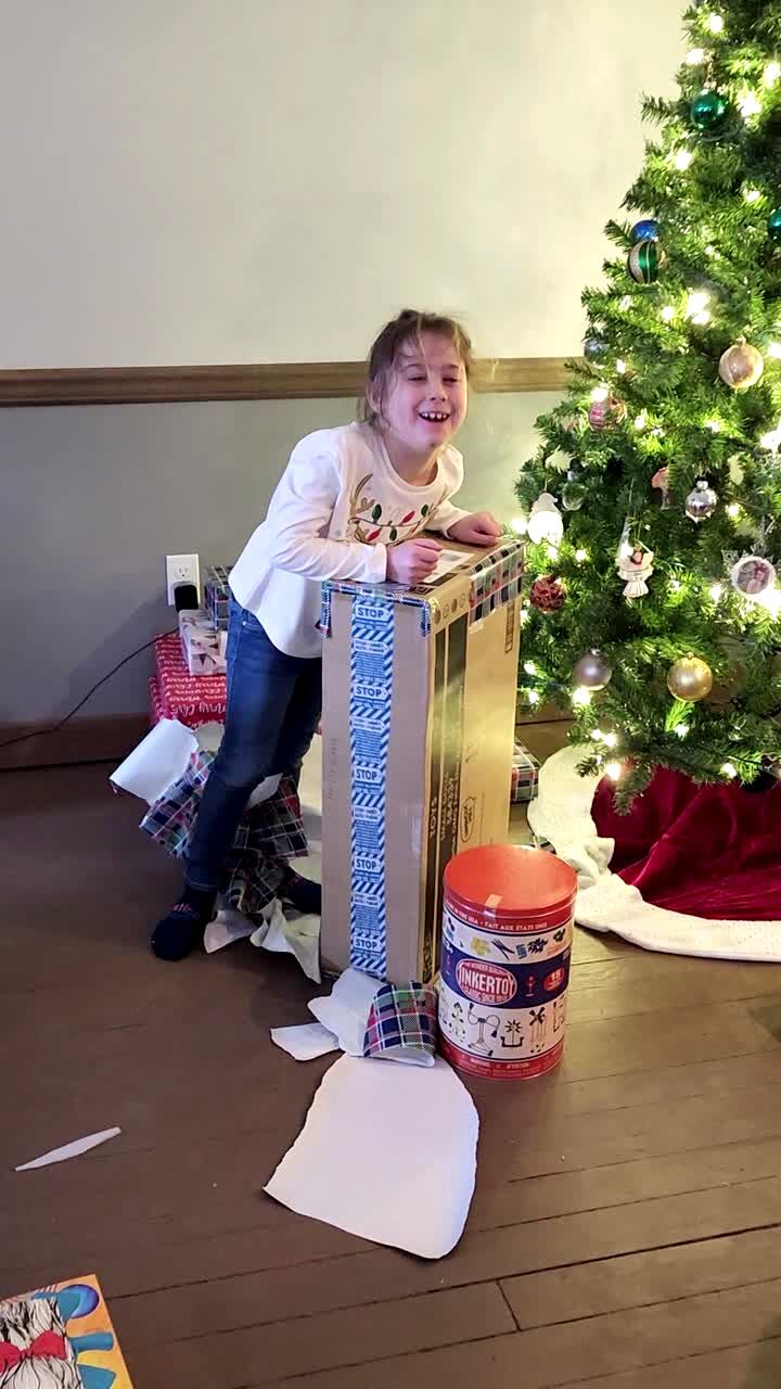 A young boy opens a Christmas present. He gets a toilet and looks at it in confusion.