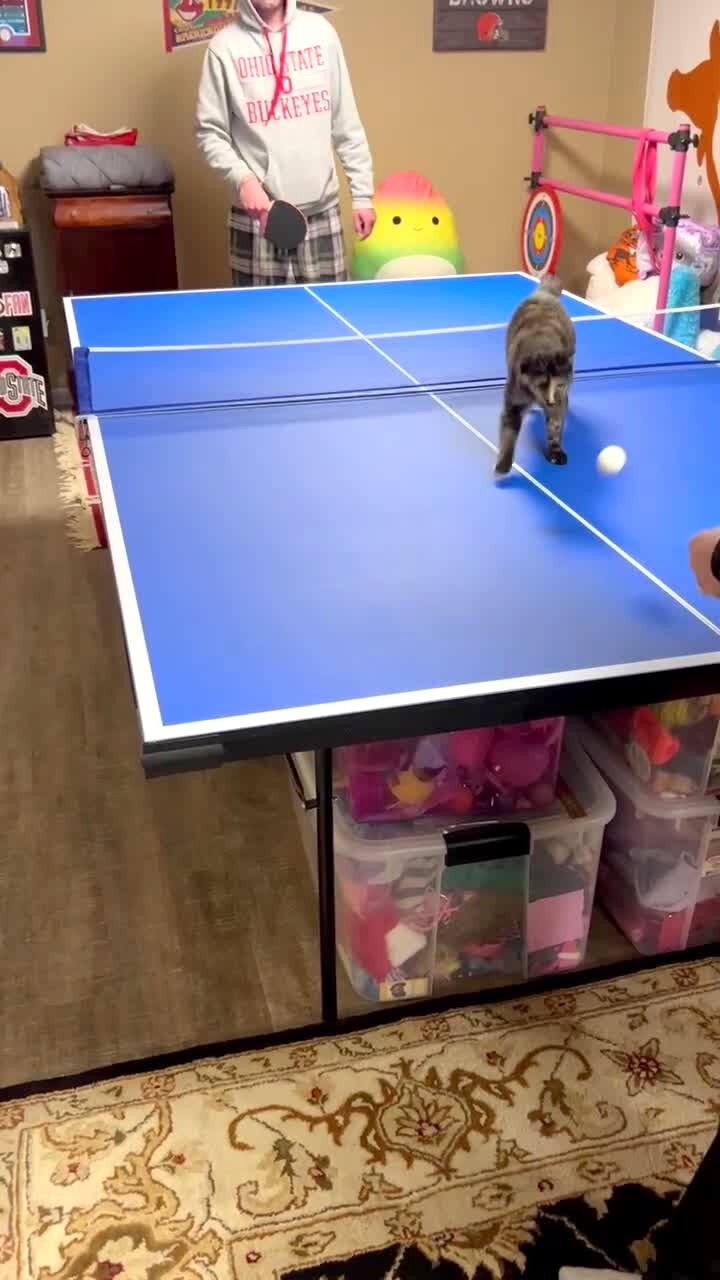 A man plays ping pong with another person in the house. A cat stands on the table and tries to get the ball.