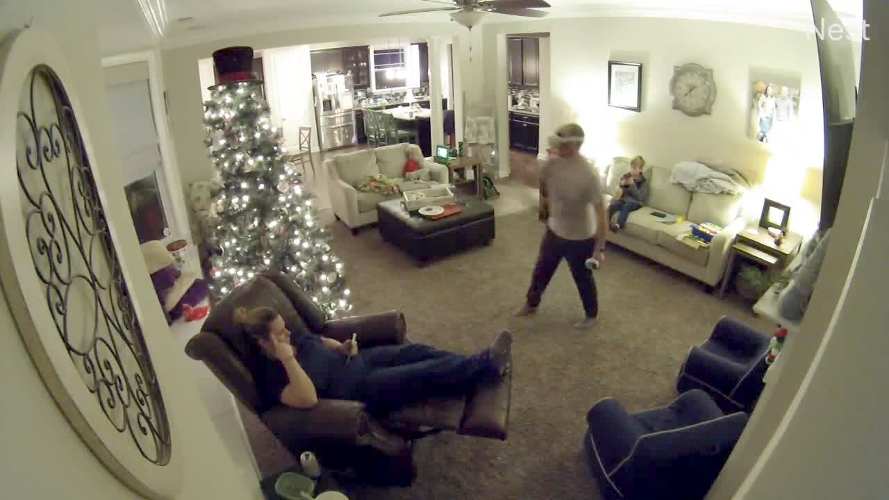A young boy plays a virtual reality video game when he runs forward and hits the television, breaking it with his controller. Security footage.