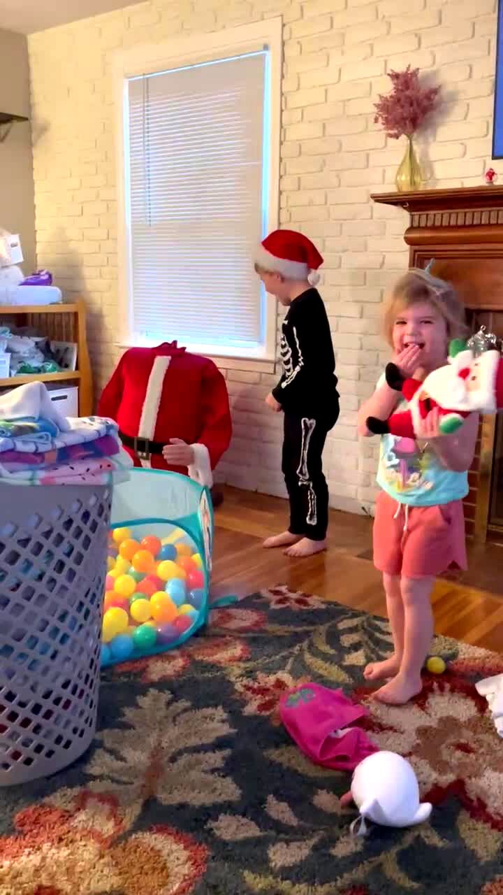 Young boys stand next to a 6 foot tall dancing Santa Claus decoration when it falls apart.