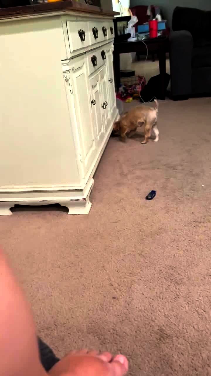 A young boy plays the violin in a house. A dog hides under a dresser. Another young boy watches.