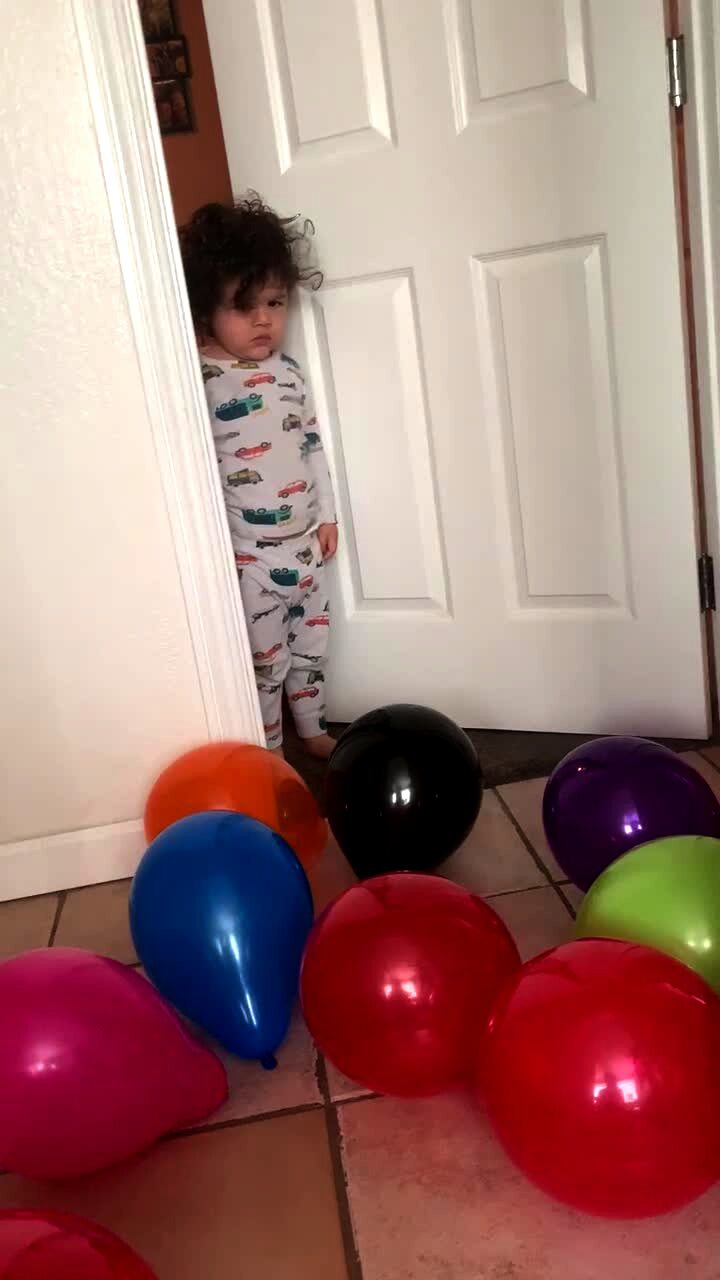 A young boy opens his bedroom door and his parents sing "Happy Birthday" to him in the the balloon filled hallway. The boy then closes the door and his parents continue to sing.